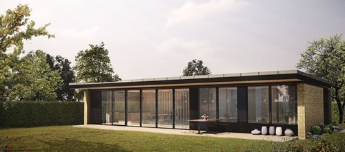 I dette første designforslag ses en bolig hvor de klassiske gule murstensvægge er blevet bevaret i husets sider, mens facaden ud imod haven har fået et mere moderne look. Det store udhæng og terrassevæg er blevet beklædt med sort træ hvilket skaber en stor kontrast til den resterende del af boligen.